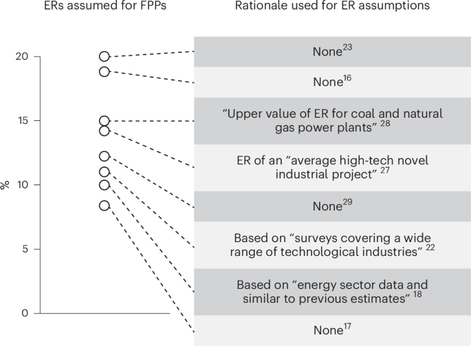 To summarize, both MFE and LFE exhibit the following technology characteristics: large unit sizes on the order of hundreds of megawatts, extremely high design complexity and an intermediate need to customize. For these characteristics, empirical evidence points to the following ERs: large energy technologies on the scale of hundreds of megawatts have ERs of 5–10% (refs. 26,32,33). Extremely high complexity alone classifies FPPs as a type 3 technology (Fig. 3b,c), which averages a global ER of 5% (ref. 31). Within the realm of type 3 technologies, our work showed that FPPs are specifically technologically close to nuclear fission power plants. Although FPPs have a need for customization that is slightly lower than that of nuclear fission power plants, this advantage is negated by the extraordinary design complexity, which is much greater than that of nuclear fission. Thus, our work supports the argument that FPPs’ ER will be similar to that of nuclear fission power plants43, which have exhibited a global ER of 2% (ref. 44). In sum, the ERs of technologies with similar characteristics to FPPs are below the previously assumed range of 8–20%. Thus, the evidence presented in our work suggests that currently assumed ERs for fusion power are without any robust rationale and overestimated. Hence, the assumed ER should be drastically reduced.